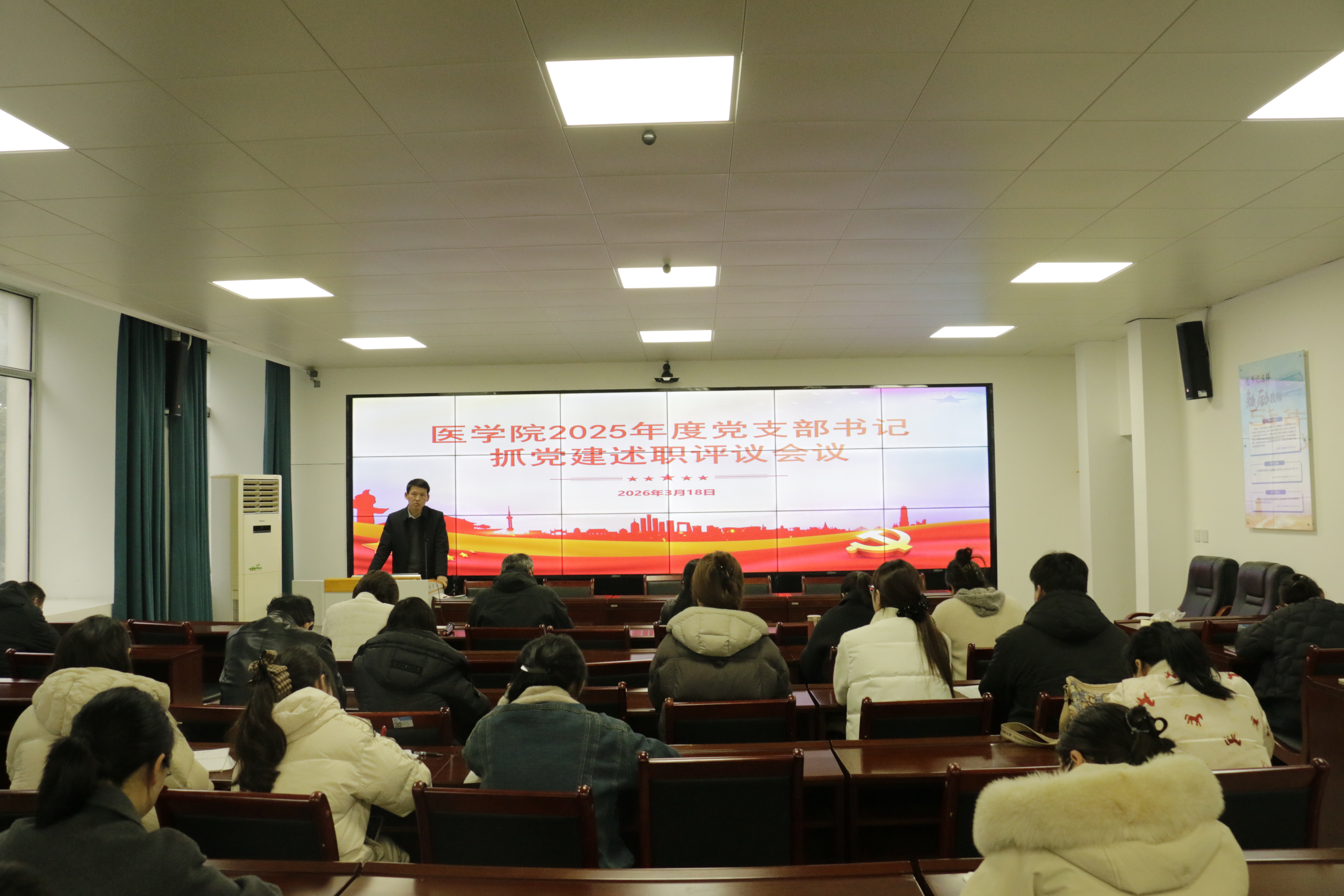 为深入贯彻落实全面从严治党要求,进一步压实基层党建工作责任,3月18日,医学院在医学楼216会议室召开2025年度党支部书记抓党建述职评议会议。医学院全体党员参加会议,会议由医学院党总支副书记(主持工作)邹华兵主持。