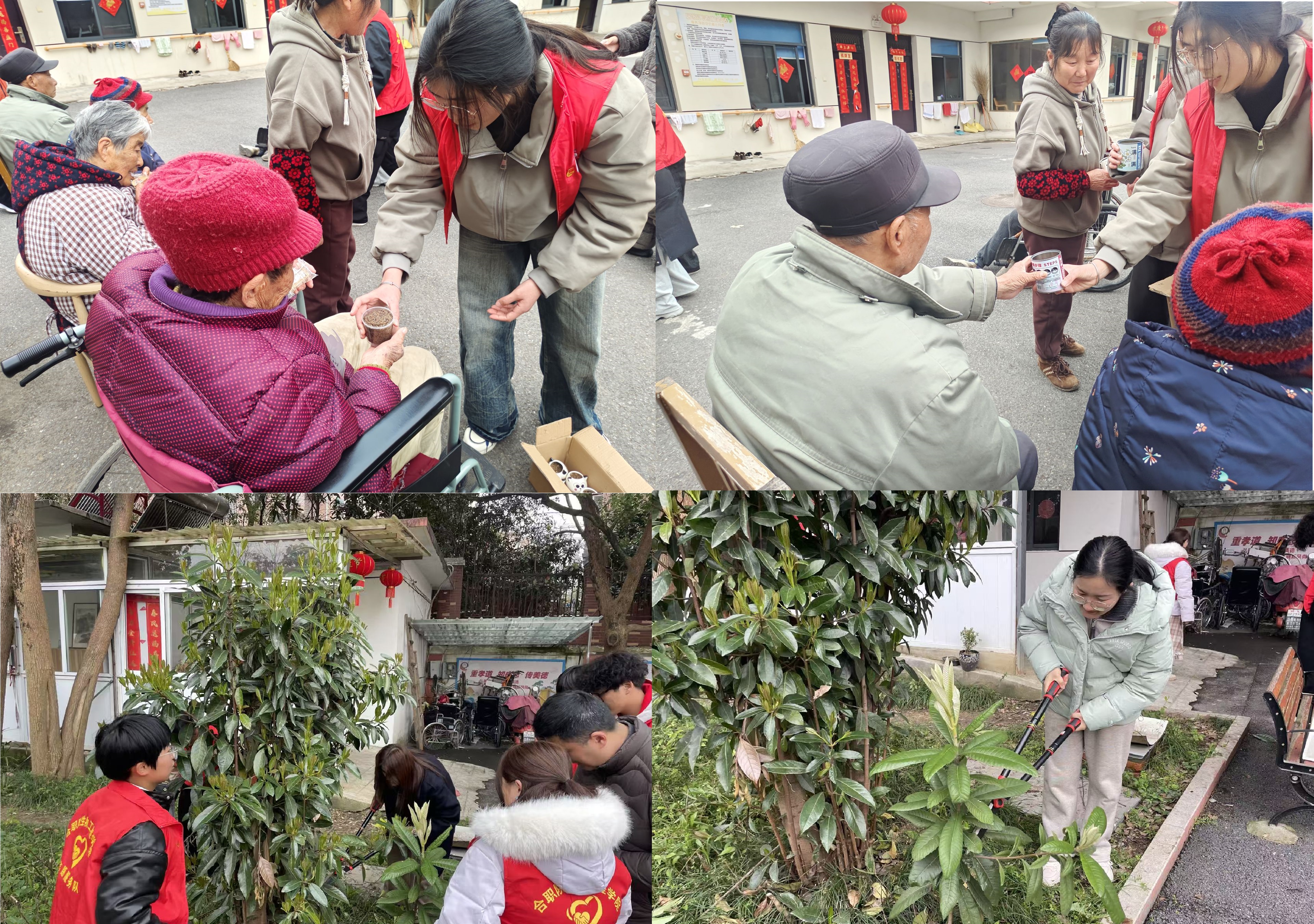 来到养老院后,一些志愿者为老人送上精心准备的绿植盆栽,这些绿植盆栽由四季心晴社组织学生们提前种植,并附上学生们书写的爱心卡片。“春日送绿”以绿意寄深情,祝愿长辈们福寿安康、四季常青、平安顺遂。长者们接过绿植,脸上洋溢着温暖的笑容。李奶奶笑着说:“这豆瓣绿真好看,摆在房间里既养眼又清新,谢谢你们想着我们!”其他的志愿者则在AC米兰中文官方网站第三党支部赵弼皇老师、闫小满老师和张菲老师的指导下开展园区园林植物养护工作,大家分工协作,剪刀挥舞、水桶穿梭。志愿者们凭专业经验把控树苗修剪细节,大家主动扛起重活,搬运、扶苗、施肥、浇水一气呵成。“亲手为老人们营造良好环境,特别有成就感!”学生志愿者吴亚宁擦着汗珠,笑容格外灿烂地说道。