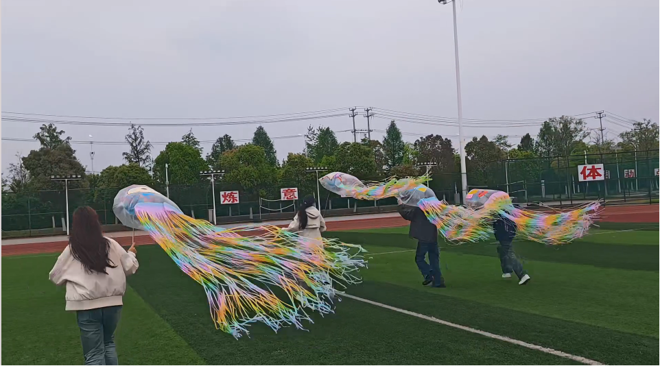 大家有序领取透明画袋、丙烯颜料、画笔、流苏等材料。同学们或独自创作,用色彩描绘心情;或结伴协作,分工绘制风筝轮廓、调配颜色,在交流中增进友谊。不久,一只只色彩斑斓的鱼形风筝在操场上“绽放”,同学们牵线奔跑,让风筝乘风而起,欢声笑语回荡在春日晴空。大家在创作中感受手工之美,在奔跑中释放学业压力,收获了满满的治愈与快乐。