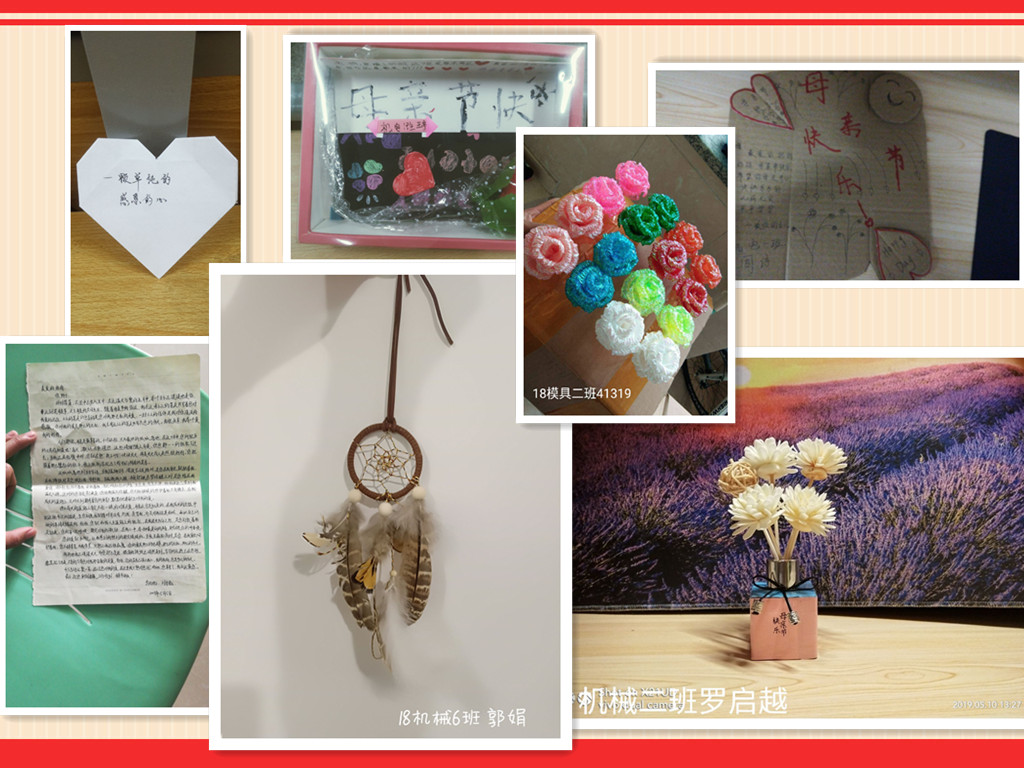 你的青春留不得遗憾,你的成长更缺不得父母的陪伴。当你背上行囊,他乡求学,你有多久没有回家,有多久没给家里打过电话?当你追爱逐梦,向往甜甜的爱情,你可还记得有多久没有拥抱过母亲对她说我爱你?当你迷上自拍,爱上修图,你的手机里又存有多少张与父母的合照?为不留遗憾、留住陪伴,机电工程学院开展的“微爱回馈”活动,一方面积极鼓励同学们以小见大,从细微处出发回馈父母之爱。活动鼓励同学们放假回家为父母分担家务、拥抱父母、大声对他们说出“我爱你”,并用视频、照片记录下这温情的时刻;另一方面,活动要求同学们利用闲暇、课余时间给父母做一份小礼物、写一封“小情书”,把平时不善流露的爱意寄托进去,把平时不愿表达的话语书写进去,用纸花传情,用信笺寄语,用“手工”诉爱,告诉父母“我身虽远、心不远,地虽偏,情不变”。机电工程学院同学们积极响应、广泛参与,在全院形成了良好的“敬父母、爱家庭”的氛围。