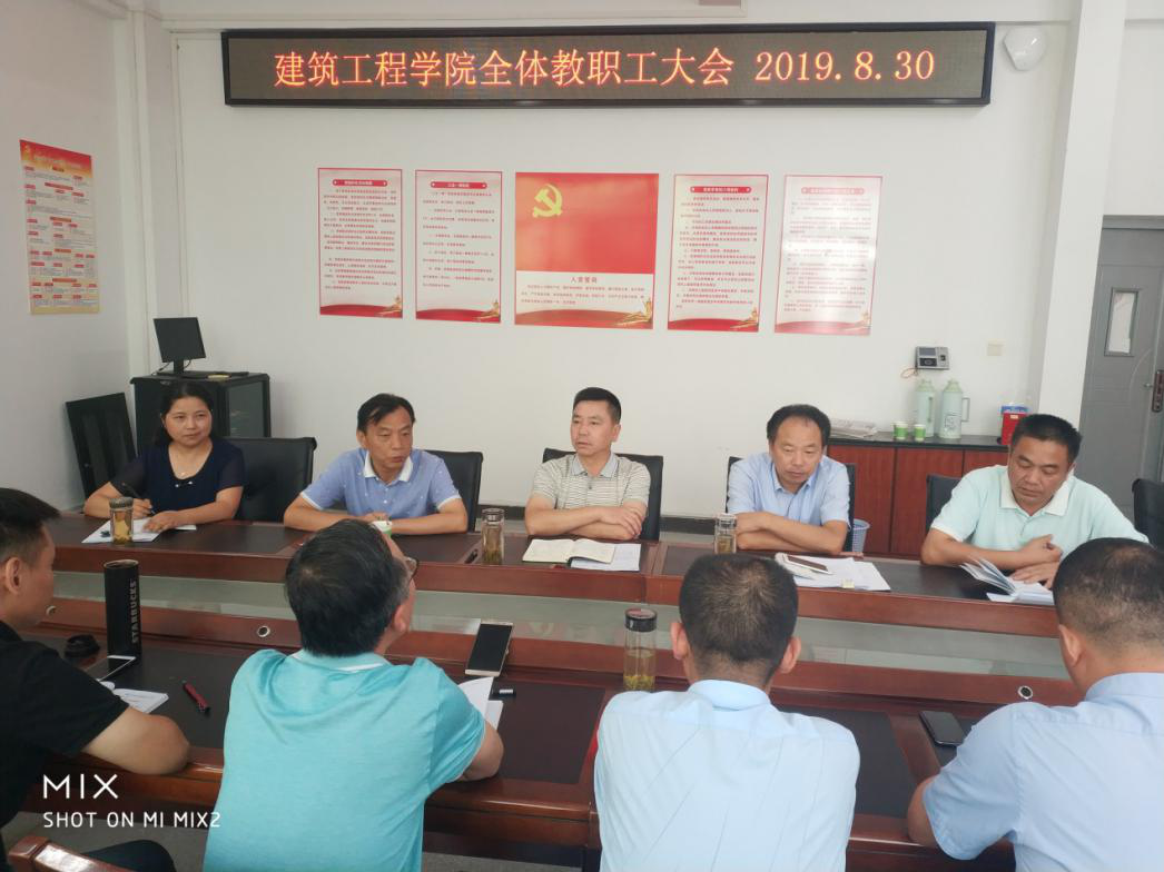 8月30日下午,在科技楼208会议室,建筑工程学院召开全体教职工大会暨政治理论学习会议,会议分两阶段进行,分别由该院党总支书记李红雨和院长范家茂主持。校党委副书记胡其云出席会议并作了讲话。