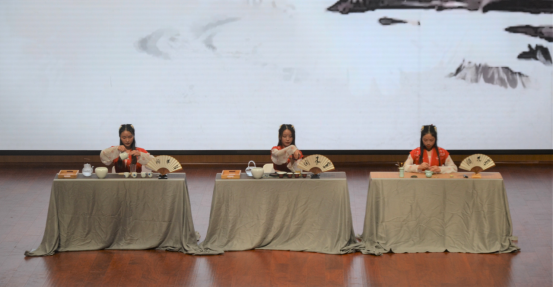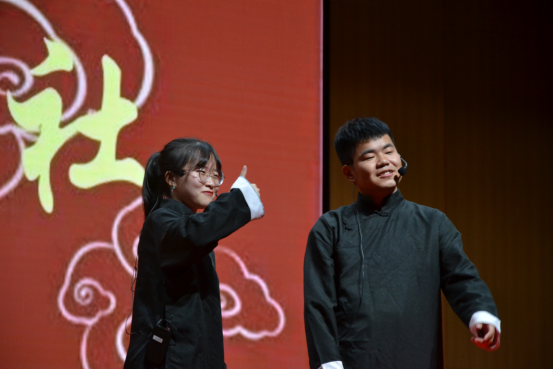 其后,李文强和章琪的相声《童年趣事》雅俗共赏,喜闻乐见,表现出了中国相声的独特魅力,一说一捧逗的现场观众无不咧着嘴大笑;孙丽芳、卞晶辉、刘畅、时美的茶艺表演,采撷树叶一片绿,制作香茗沁心脾,汤色红绿味甘爽,饮茶三杯心皈依。图南国学社的汉服书法秀《关山南》表演的书法文字“垂露春光满,崩云骨气馀”,向同学们展示了中华民族传统文化的独特魅力;随后连续三首歌曲《孤独患者》、《李白》、《忽而今夏》则为同学们带来了一场又一场的听觉盛宴。