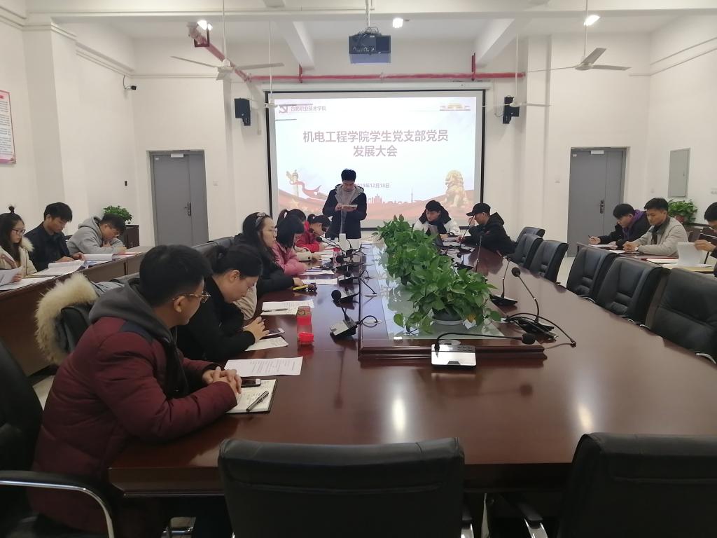 12月18日下午,机电工程学院学生党支部在机电楼二楼会议室召开党员发展及转正大会,学生党支部全体党员、培养联系人、6名预备党员及9名发展对象参加了会议。会议由该院学生党支部书记朱何萍主持。