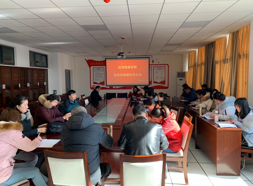 为做好2019-2020学年第一学期期末学生管理工作,部署学期结束阶段学生管理工作以及假期的文明安全教育,12月31日中午,经贸旅游学院召开辅导员、班主任工作会议,所有在校班级专兼职辅导员、班主任老师参加了此次会议。会议由该院党总支副书记尹仕果主持。