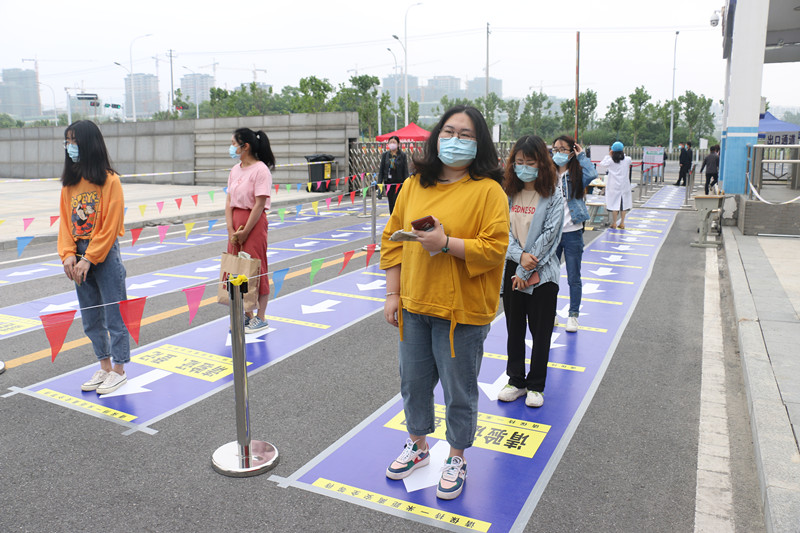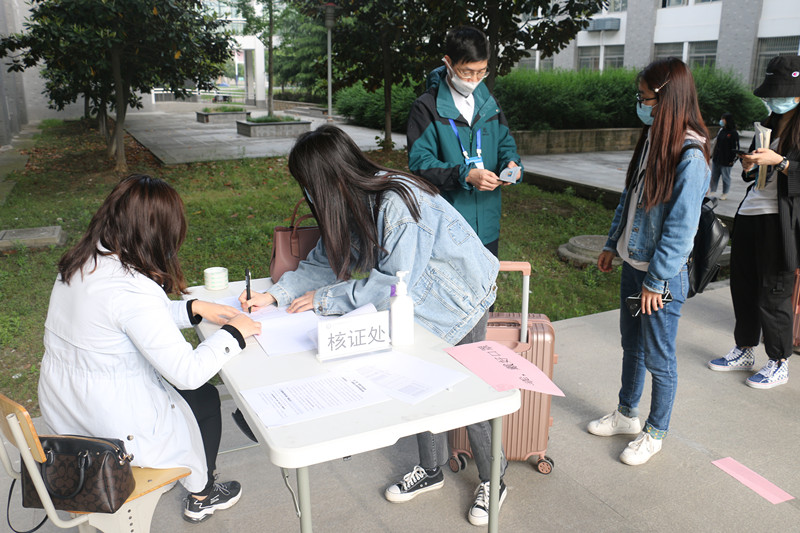 学生返校当天上午7点整,所有教师全部到岗。大家在各自岗位上忙碌着:在校门口,有的负责前行引导,有的负责统筹协调,有的负责核验安康码、学生额温测量,有的负责消毒、口罩更换,有的负责证件审查、填写《体温记录表》并签写《AC米兰中文官方网站学生健康承诺书》……学生们严格按照报到流程,戴着口罩前后间隔一米排队,现场井然有序。在教学楼,有专人引导学生进入考场,有人负责现场巡逻维持秩序,现场考试有序。学生离校后,学院还将进行学生离校行程统计汇总,确保学生安全回家。