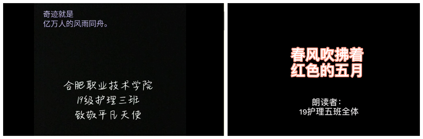 各班级积极踊跃,用多样的形式参与到护士节的庆祝活动中。云课堂、有奖竞猜、急救模拟等活动让同学们对护理专业知识有了进一步的加深,对护理这份工作有了更深层次的理解;朗诵、演讲、云合唱、手语舞表演等活动表达出学生们对护理职业的热爱与信仰。