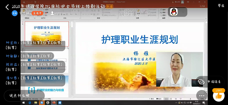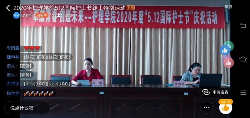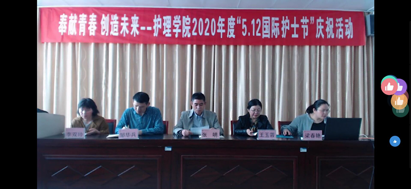 为庆祝“5•12”国际护士节,弘扬南丁格尔精神,5月11日上午,护理学院通过“钉钉直播”的方式举办了庆祝5•12国际护士节系列活动。护理学院党总支书记张明、副院长(主持工作)王玉蓉、副书记邹华兵、副院长梁春艳、护理学院护理教研室主任李双玲及护理学院护理专业全体师生参加了本次活动。活动由梁春艳副院长主持。