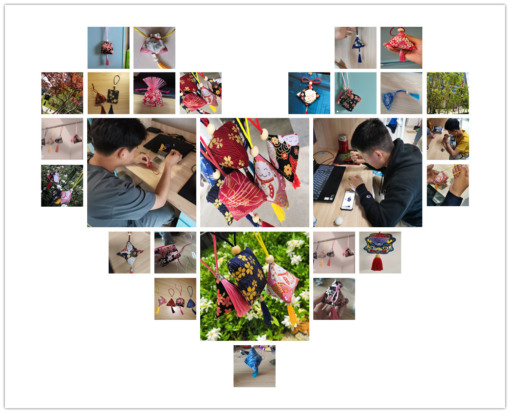本次活动提前发放艾草、布块、针线等材料包至各班级,然后在班级QQ群中发布制作视频,同学们根据视频在宿舍制作,也可自由创作,作品完成后回收剩余材料。