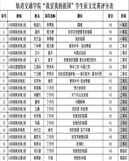 为让学生们深刻感悟抗“疫”中的新时代中国精神,激发爱国热情,增进家国情怀,坚定理想信念,强化使命担当,厚植深厚的爱国之情,轨道交通学院组织了“我爱我的祖国”学生征文比赛活动。