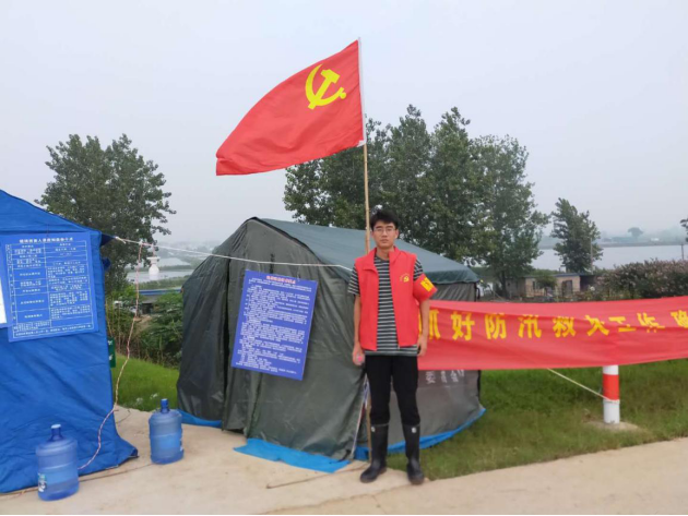 19影像2班常委龙同学家住淮河岸边,自入夏以来,连日降雨,淮河水位急速上涨,当地政府紧急招募抗洪抢险志愿者。得知这个消息后,他第一时间联系当地镇政府加入了抗洪抢险队伍,不分昼夜地在淮河岸边巡堤护堤,参加处置突发险情。他常常顾不上休息,一干就是数个小时,衣服也经常被雨水浸湿,累了困了就在临时工棚席地而睡。