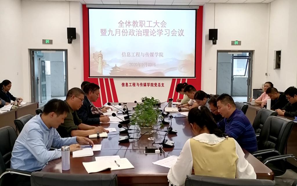 9月23日下午,信息工程与传媒学院在信息楼103楼会议室召开全体教职工大会暨九月份教职工理论学习会议,会议由该院党总支书记李红雨主持,全体教职工参加大会。