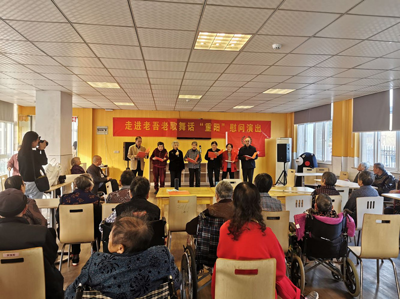 一来到养老院,志愿者们就有条不紊地忙碌起来,有的布置会场,有的陪老人们聊天。演出正式开始后,台上载歌载舞,台下欢声笑语。大一新生志愿者带来节目三句半,激情昂扬的语调配上响亮的器材,给老人们带来了欢乐;老人们的大合唱表演,把演出推向高潮;陈亦璐同学吉他弹唱的《一封家书》将重阳节的气氛表现的淋漓尽致……此次演出在众人的合唱声中落下帷幕。