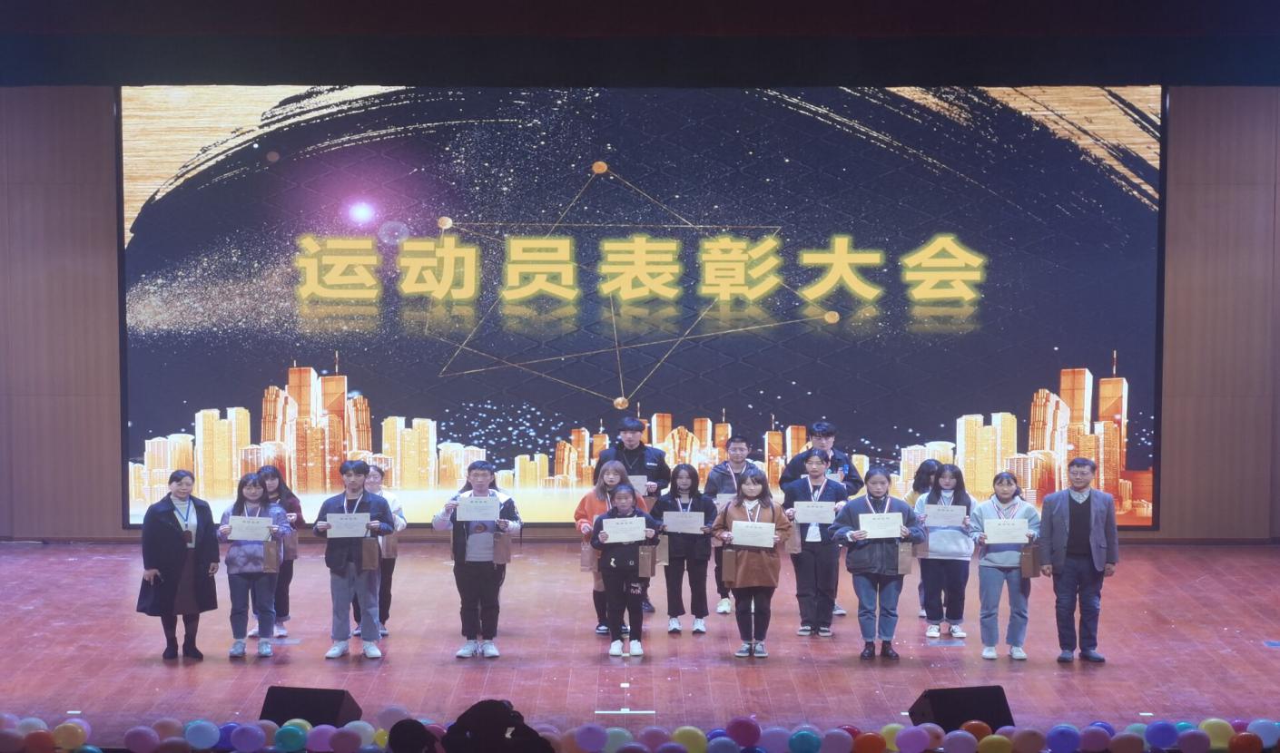 晚会最让人激动的环节是运动会颁奖仪式。刚刚结束的2020年校运动会,经贸旅游学院的运动健儿不畏艰难,顽强拼搏,取得了运动会团体总分第二名的优异成绩。背景视频既重现他们在赛场的飒爽英姿,也放大了他们拼搏的汗珠和激动的泪水。