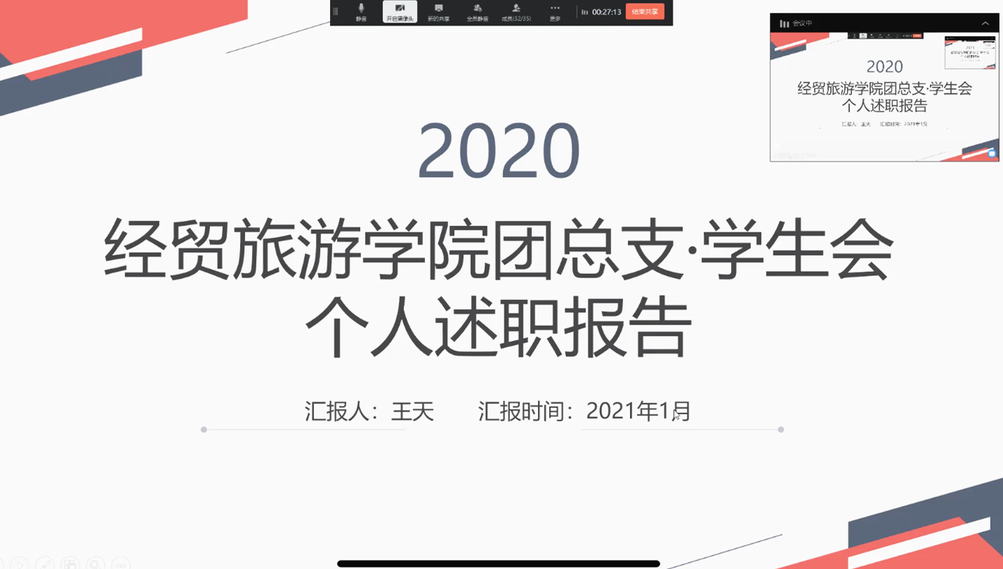 1月13日,经贸旅游学院开展线上2020年度学生会工作年终述职报告,经贸旅游学院团总支书记赵倩倩、专职组织员贾海洋、学管办老师代表孙紫娟以及学生会各部门负责人和学生代表参加了本次大会。