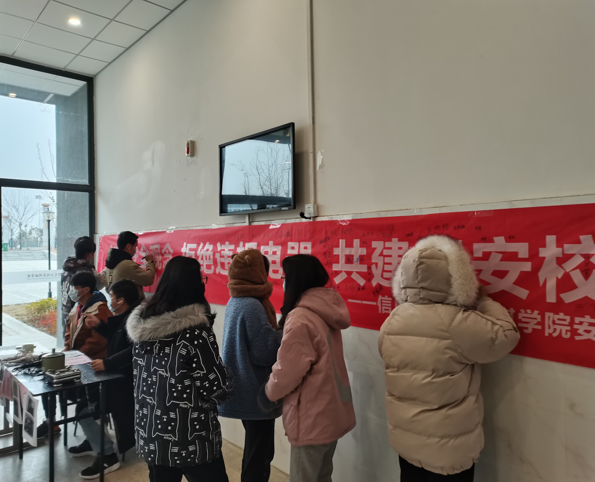 开展“加强安全观念拒绝违规电器共建平安校园”签名活动。1月6日下午,在信息楼北门口举行“加强安全观念拒绝违规电器共建平安校园”签名活动,辅导员崔鹏老师带领团学干部、各班生活委员和学生参加。