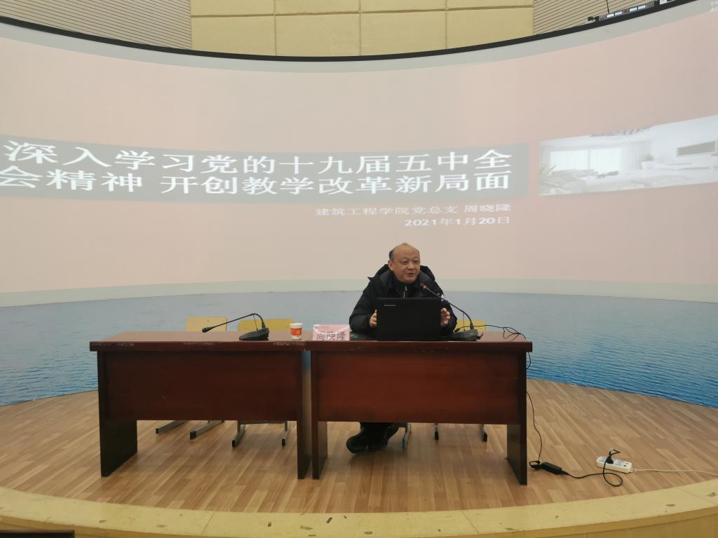 2021年,是“十四五”开局之年,也是乘势而上开启全面建设社会主义现代化国家新征程、实现第一个百年奋斗目标的关键之年。为使建工学院党建工作开好局、起好步,1月20日下午,该院党总支邀请校党委委员、副校长周晓隆为该院全体教职工上了题为“深入学习党的十九届五中全会精神、开创教学改革新局面”的非常生动而又深受启发的党课。