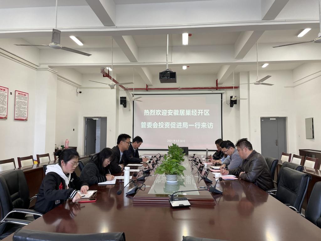 3月30日下午,安徽居巢经开区管委会投资促进局携上海钟盈企业发展有限公司一行来访机电工程学院,双方就校企合作进行了交流。安徽居巢经开区管委会投资促进局彭琴、上海钟盈企业发展有限公司副总经理宋斌、招聘经理李峰、项目经理温涛、机电工程学院党总支副书记(主持工作)王克勇,学院副院长孙新梅、院党总支副书记丁迎春及相关教师参与此次会议。