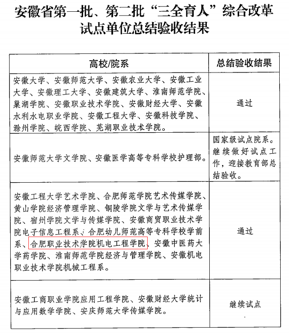 近日,安徽省委教育工委下发《中共安徽省委教育工委关于公布安徽省“三全育人”综合改革试点单位总结验收、中期评估和第四批试点申报评审结果的通知》(皖教工委函〔2021〕145号),机电工程学院作为安徽省首批“三全育人”综合改革试点院系,顺利通过验收。