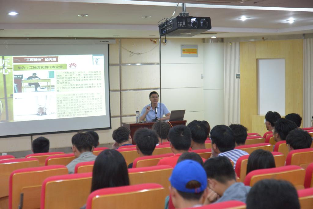 报告主讲人马克思主义学院施敏发副教授,主要围绕“工匠精神的内涵”“为什么要弘扬工匠精神”“我们身边的工匠精神”以及“如何弘扬工匠精神”等四个方面,结合具体案例,一一展开。施敏发从中国工匠文化的代表企业——华为所推崇的耐得住寂寞的科技精英中国科学院院士李小文开始讲起,其中穿插了两校区主题雕塑“奋飞”、“奔跑”,以及汇心湖校区汇德广场行塑的卓越匠心中国传统文化“工匠精神”中的“铁杵成针”“切磋琢磨”“庖丁解牛”“匠石运斤”“鬼斧神工”“得心应手”“唯手熟尔”“大匠斫轮”等八根雕塑文化柱所营造的工匠文化。报告中,他既对中华第一人文圣祖有巢氏率领人类从穴居走向巢居,为人类居住环境的改善做出开创性的贡献大加赞赏,也号召同学们深切缅怀“杂交水稻之父”袁隆平,引起共鸣。他认为“工匠精神”是深藏于中华民族基因中的精神密码,将“为人之道”渗透到“为学之道”之中,大力倡导“知行合一”,学生深受启发。