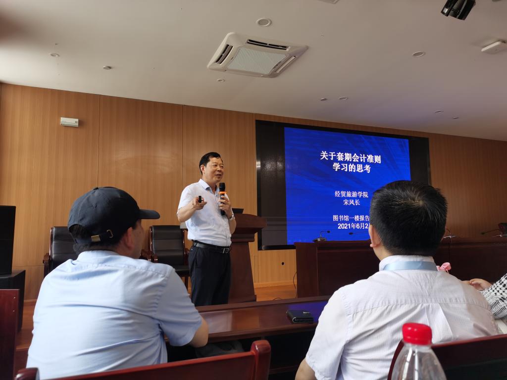 为了进一步推动“三教”改革,丰富教科研活动的内容,提升专业教师特别是青年教师的教研水平,全面提高课堂教学水平和人才培养质量。6月2日下午,经贸旅游学院在汇心湖校区图书馆一楼学术报告厅精心组织了一场由安徽省高职高专会计专业带头人、省级教学名师、全省优秀教育工作者、经贸旅游学院宋风长教授主讲的题为《关于套期会计准则学习的思考》专题学术报告会。会计教研室全体教师、19级会计专业部分学生代表听取了报告。报告会由经贸旅游学院副院长陈继林教授主持。