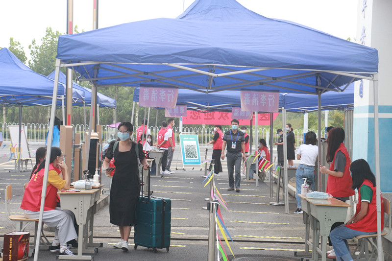 早上七点,各工作组人员已经全部到位,严格按照学校疫情防控相关要求,用扎实细致热情的工作做好学生安全返校工作。学生们按照计划时间到达校门口,在“一米线”间隔排队、先后进行安康码核查是否绿码、疫苗接种与否、14天行程有无异常、核酸检测报告是否阴性等信息核验、测额温、行李与手消毒、更换口罩、信息登记等多个环节,报到现场井然有序。