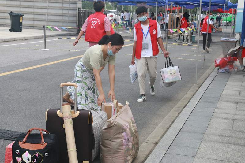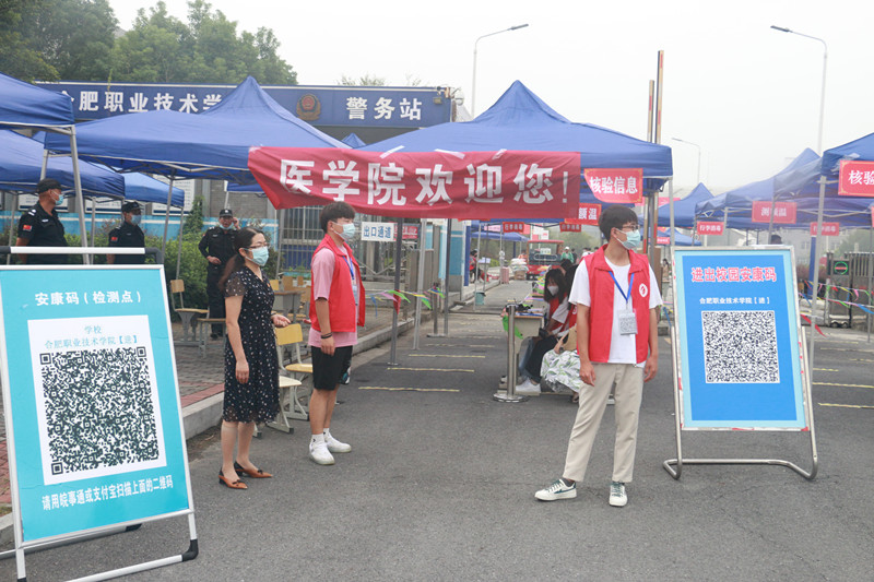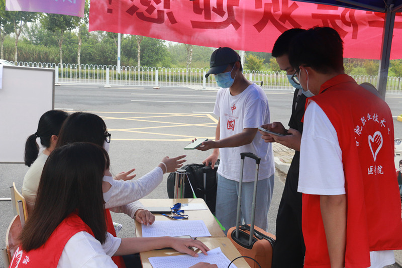 清晨7点,医学院迎新工作人员在学校大门东门准备就绪,等待新生的到来。新生们来到校门口,在“一米线”间隔排队,经查验录取通知书后,先后进行安康码核查是否绿码、疫苗接种与否、14天行程有无异常、核酸检测报告是否阴性等信息核验、测额温、行李与手消毒、更换口罩、信息登记等多个环节。在志愿者的引导下,报到现场井然有序。