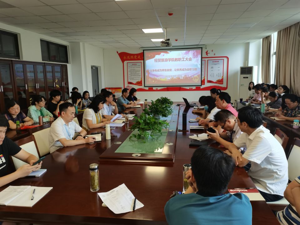 新学期,新气象。8月26日下午,经贸旅游学院在会议室召开全体教职工大会,学院党政、全体教职工参加会议。该院院长赵红教授主持会议。