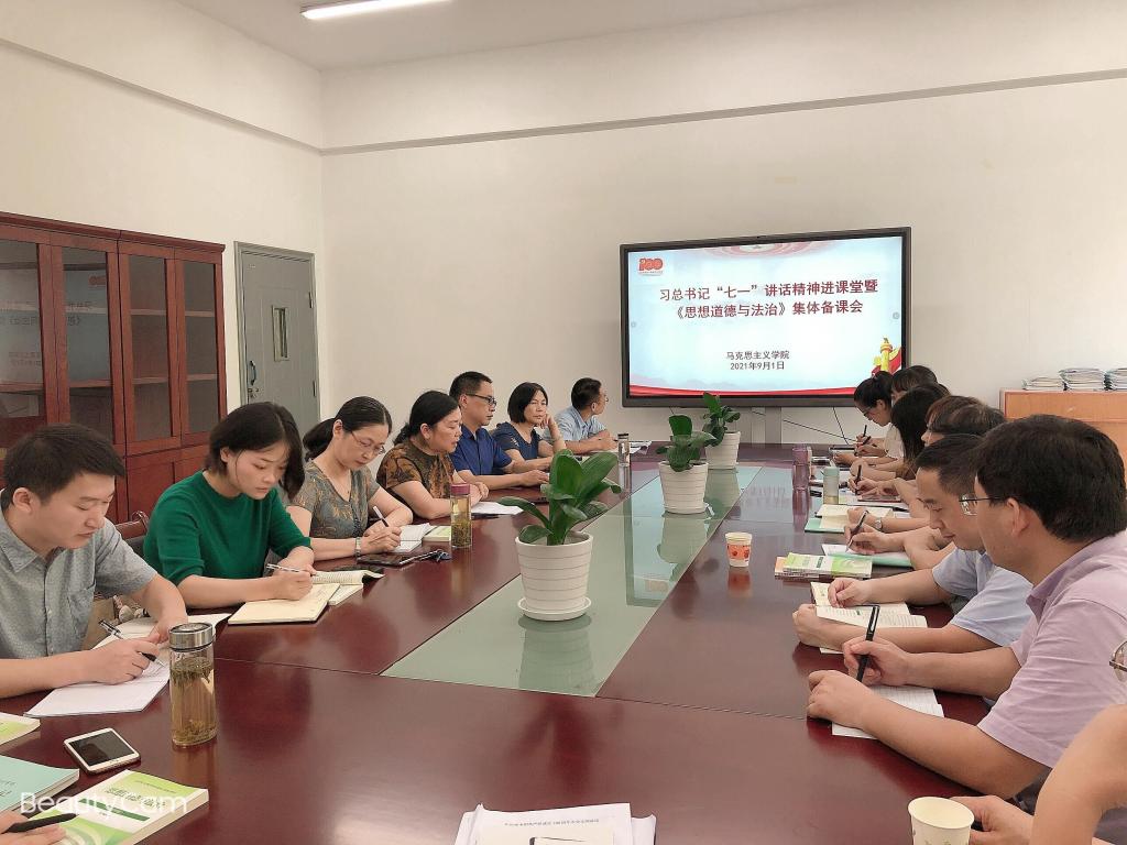 为持续深入学习习近平总书记在庆祝中国共产党成立100周年大会上的重要讲话精神,落实中共教育部党组印发《关于教育系统认真学习贯彻习近平总书记在庆祝中国共产党成立100周年大会上的重要讲话精神的通知》要求,扎实推进“七一”重要讲话精神进教材、进课堂、进头脑,根据马克思主义学院教学工作的统一部署和任务安排,9月1日下午,该院在学院会议室组织开展习近平总书记“七一”重要讲话精神进课堂暨《思想道德与法治》课第一次集体备课会。