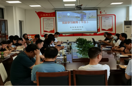9月1日下午,经贸旅游学院在会议室党史学习专题会,学院党政、全体教职工参加会议,党总支副书记尹仕果主持会议。