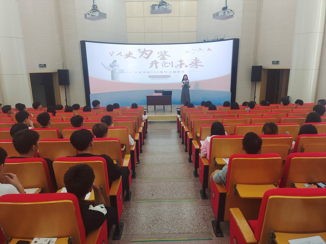 活动分两阶段进行。首先,该院昌逸文老师为同学们带来了一场精彩的主题讲座。昌老师以学习习近平总书记在纪念辛亥革命110周年大会上的讲话精神为中心,从三个方面和同学们分享了她的思考和感悟:一、辛亥革命对于国家、民族乃至每一个普通人的意义是什么;二、辛亥革命体现的民族精神、需要新时代青年人传承的精神有哪些;三、回望历史,发扬孙中山先生等辛亥革命先驱的伟大精神,携手向着中华民族伟大复兴的目标继续奋勇前进是新时代青年人的历史使命。