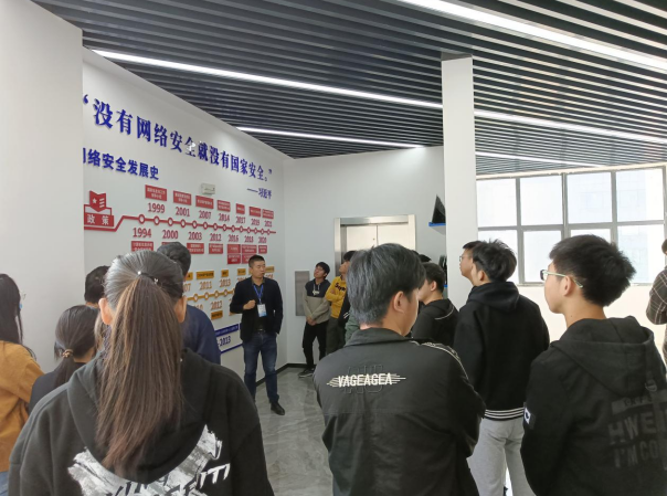 讲座的第二个环节是参观网络安全中心基地文化长廊,主讲老师向同学们介绍了网络安全发展史、国家网络安全政策、常见的网络病毒攻击及网络安全产业发展前景。