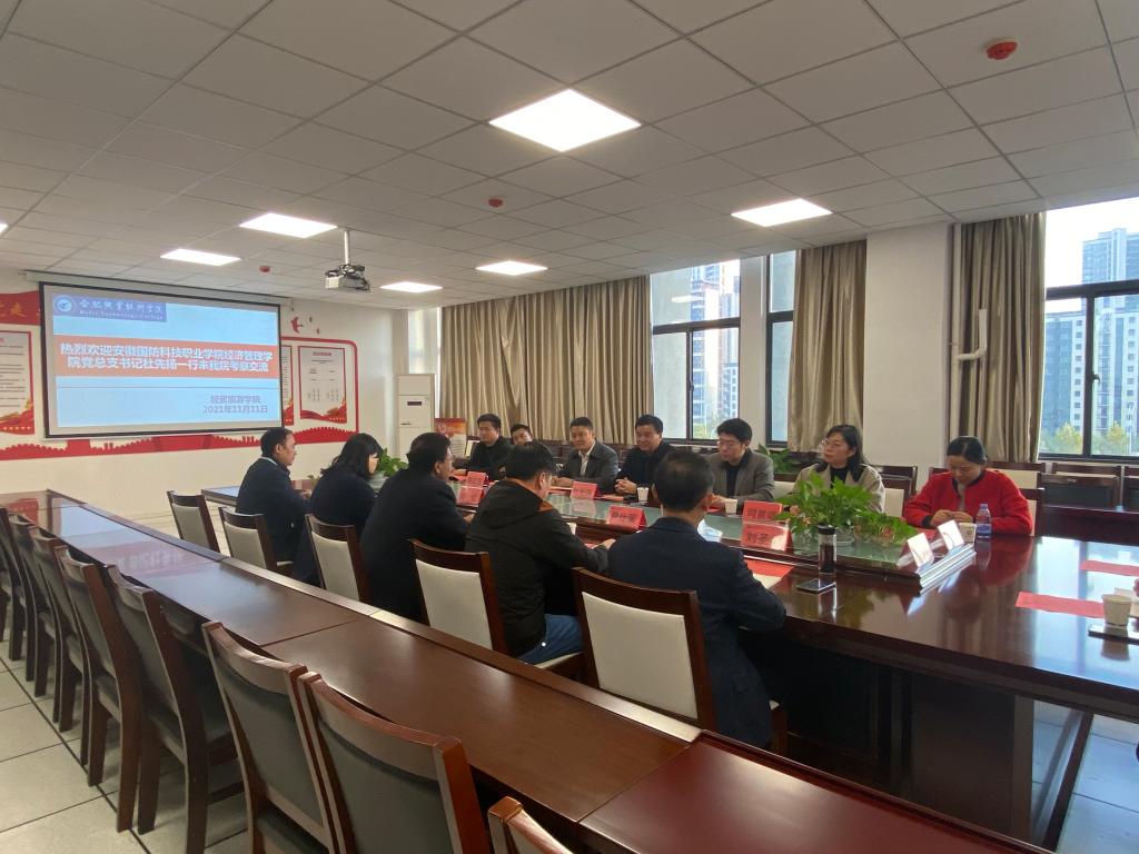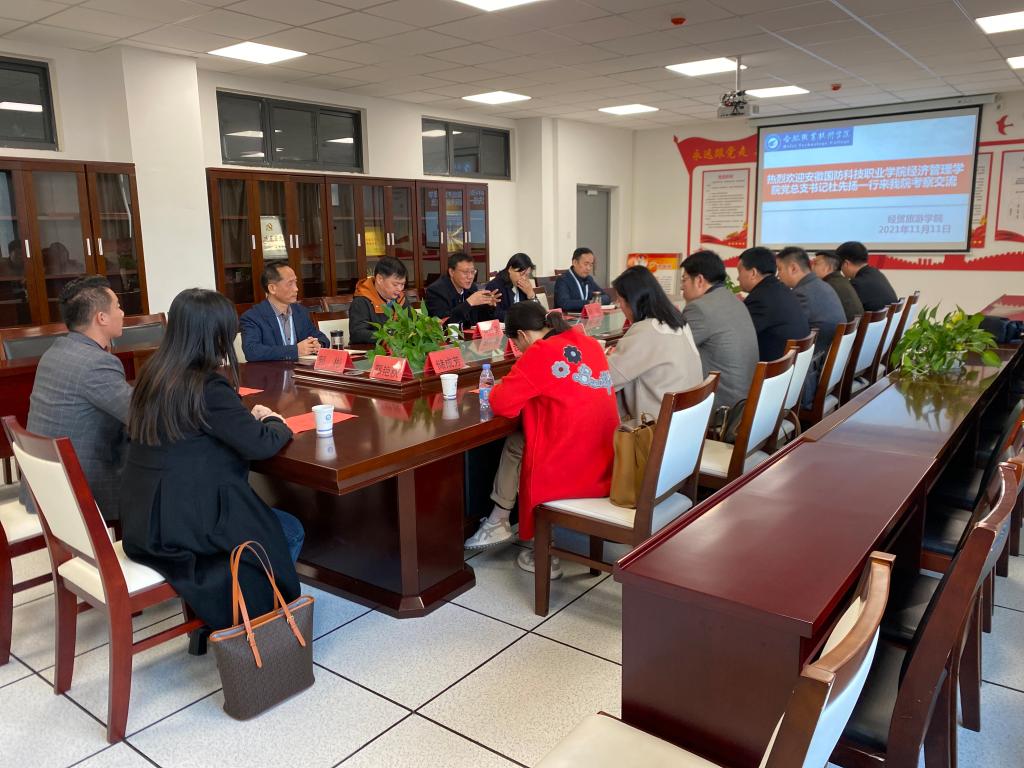 11月11日,安徽国防科技职业学院经贸管理学院党总支书记杜先扬、院长杨力、上海理想人力资源有限公司合肥服务中心总经理赵中华一行9人来经贸旅游学院考察交流。经贸旅游学院党总支书记梅亚松、院长赵红、副书记尹仕果、副院长陈继林、刘圣春在经贸楼会议室接待了来访客人。交流会由尹仕果主持。