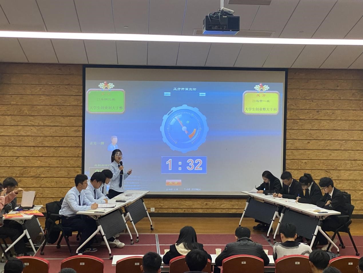 决赛辩题为“在校大学生创业的利与弊”。双方参赛队伍由抽签决定辩论方,在主持人一声“开始”后,正反方一辩各做限时为两分钟的陈词。在开篇立论环节,正方以大学校园鼓励创新并举办各类双创比赛为切入点,阐明“在校大学生创业利大于弊”这一观点;反方则以大学生更应该侧重于提升自身素质,学习科学文化知识,夯实基础为论点,陈述反方“在校大学生创业弊大于利”这一观点。在攻辩环节,双方选手据理力争,引经据典,口若悬河,始终围绕主题展开激烈辩论。整场比赛高潮迭起,精彩不断,现场气氛十分活跃。经过激烈的角逐,最后,21级城轨运营1班获得冠军,21级城轨车辆2班获得亚军。