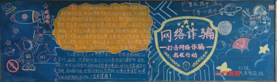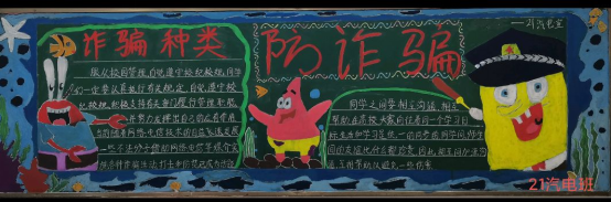 此次活动受到了2021级各班级的高度重视,从板报样式选定到板报创作再到上色和文字书写,各班级都做了精心准备,配备了充足的人力、物力和财力资源。有的班级绘出网络诈骗漫画告诫同学预防照片;有的班级则搬上了“国家反诈中心”APP图标警示网络诈骗。此次活动的举办,提高了汽车工程学院师生的防范电信网络诈骗安全意识,使该院学生对于诈骗的形式和内容有了更进一步的了解。(供稿:汽车工程学院 编辑:杨璨)