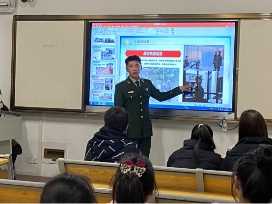 临近年末,2022年的春季征兵工作拉开了序幕。为使2022届毕业生和部分有参军入伍意愿的在校生了解国家大学生入伍政策和资助政策,经贸旅游学院邀请21旅游管理1班退役复学学生龚子彧,结合其自身当兵经历,在教学南楼101、403等多个教室开展入伍政策宣讲活动,2022届毕业生和部分有参军入伍意愿的在校生代表共200多人听取了本次宣讲。