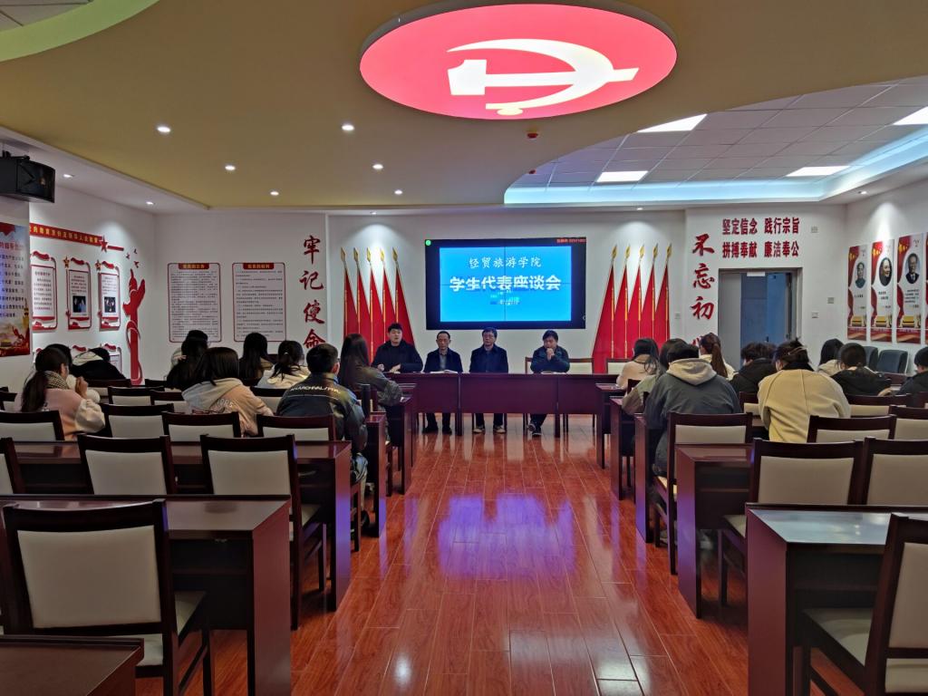 12月23日下午,经贸旅游学院在学院三楼党性体验馆召开学生代表座谈会。学院党总支书记梅亚松,副书记尹仕果,学院副院长刘圣春出席座谈会,来自全院在校班级的42名学生代表参加座谈会。座谈会由学院学管办主任王明明主持。