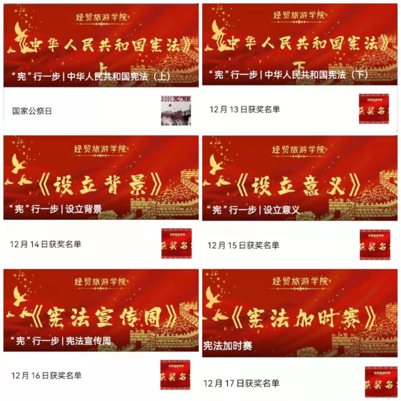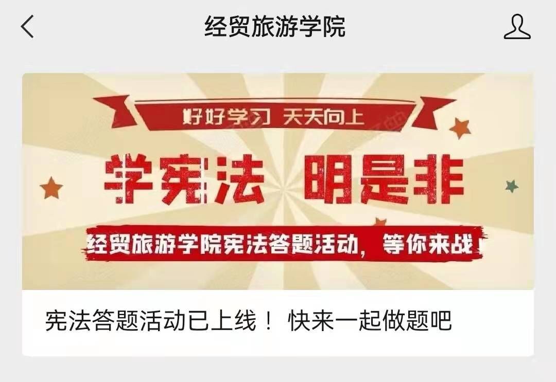 为深入学习宣传习近平法治思想,做好习近平法治思想进教材、进课堂、进头脑工作,铸牢广大青年成长成才的法治思想基础,经贸旅游学院通过主题班会、手抄报等多种形式开展第四个宪法宣传周系列活动,其中,12月13日-18日通过经贸旅游学院微信公众号开展的宪法知识“微学习”有奖答题活动,激发起师生最大的参与热情。