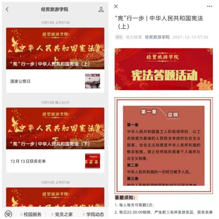 此次宪法学习有奖答题活动分为两个阶段。第一阶段,12月13日至12月17日,为期五天的宪法知识学习,公众号每日推送一篇宪法知识内容,每日20题,学习宪法基础知识,增强守法、知法意识。第二阶段,12月18日,历经了5天的基础知识学习后,开启最终较量——宪法知识有奖竞答。参与的同学都有在线礼包赠送,3名优胜者还获得特别的奖品。这种新的学习形式赢得了众多师生更积极的参与,有奖竞答当天参与人数就有1000多人。