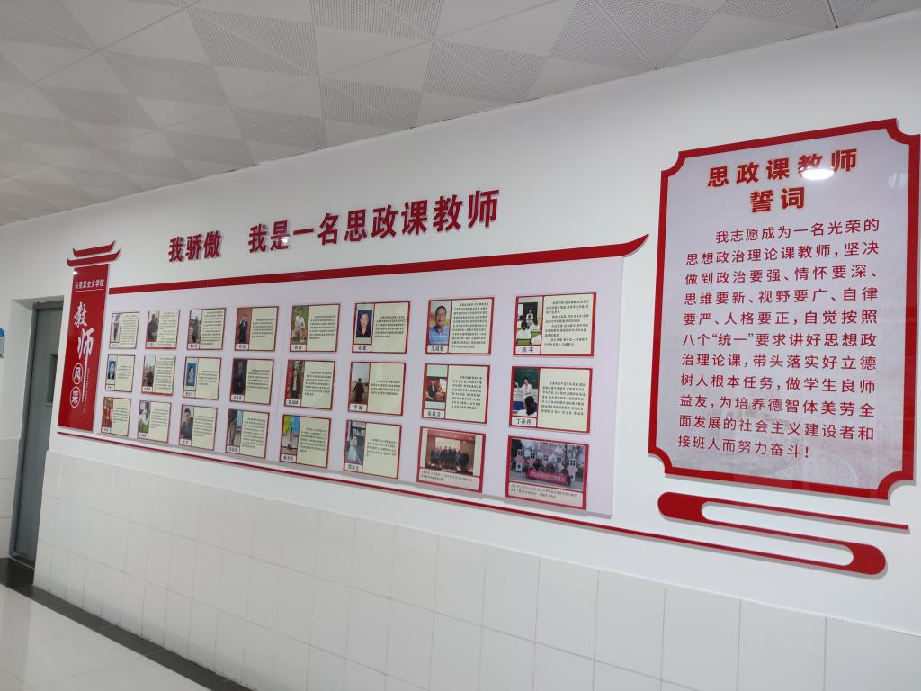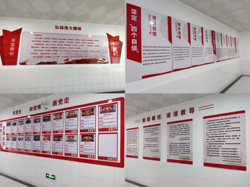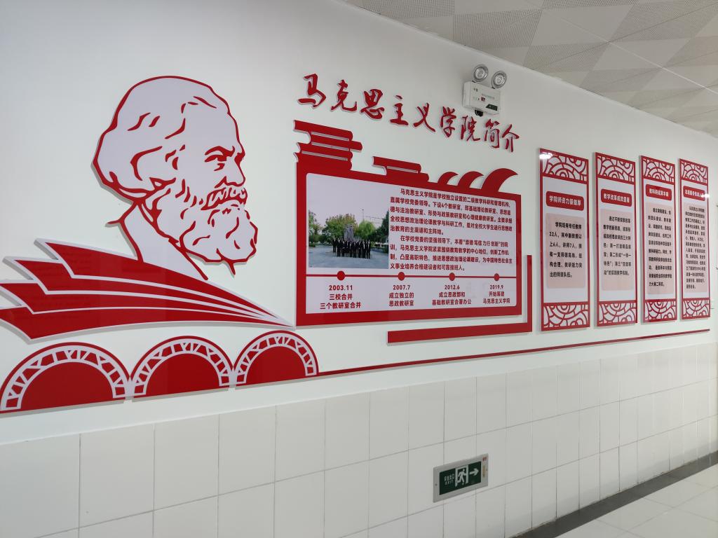 整个文化墙以学院现有办公教学场所为项目建设主要区域,其内容涵盖了马克思主义经典作家简介、党的光辉历程、中国共产党人的精神谱系、习近平总书记对思政课教师的殷殷嘱托和谆谆教诲、学院简介、教师风采、活动展示等主题;形式上,设计精巧、图文结合、简洁大气、布局协调、搭配合理;整个布局恢宏大气、庄重大方,充分体现了时代赋予高校马克思主义学院的铸魂育人、立德树人的历史使命和光荣任务。