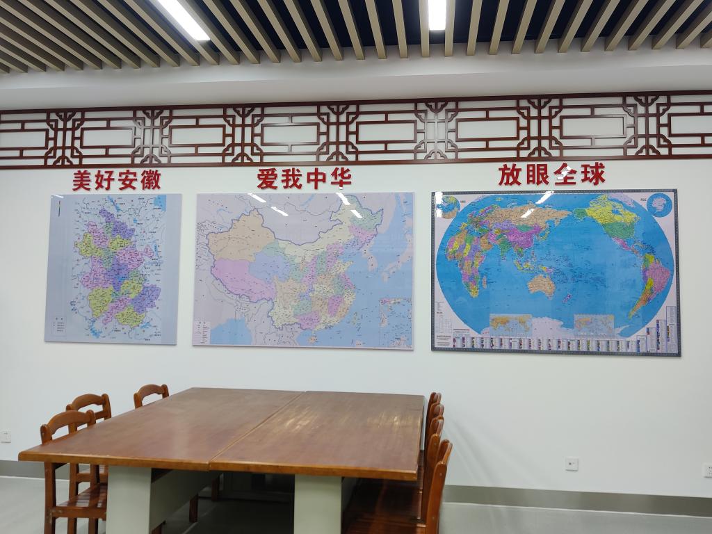 世界地图、中国地图、安徽地图三张地图,展现了师生们的全球视野、爱国之情和对安徽建设的憧憬。世界地图——放眼全球,纵观世界,用大局观念、广阔视野,探世界之变局;中国地图——爱我中华,放眼中国,用爱国之情、热血之心,创中华之盛世;安徽地图——美好安徽,瞭望故土,用故乡之情、团结之力,建美好安徽。在青苹果课外交流中心,通过教师领学、学生自学、师生互动、同台展示等方式,让学生的实践中学知识、长才干、提素质。