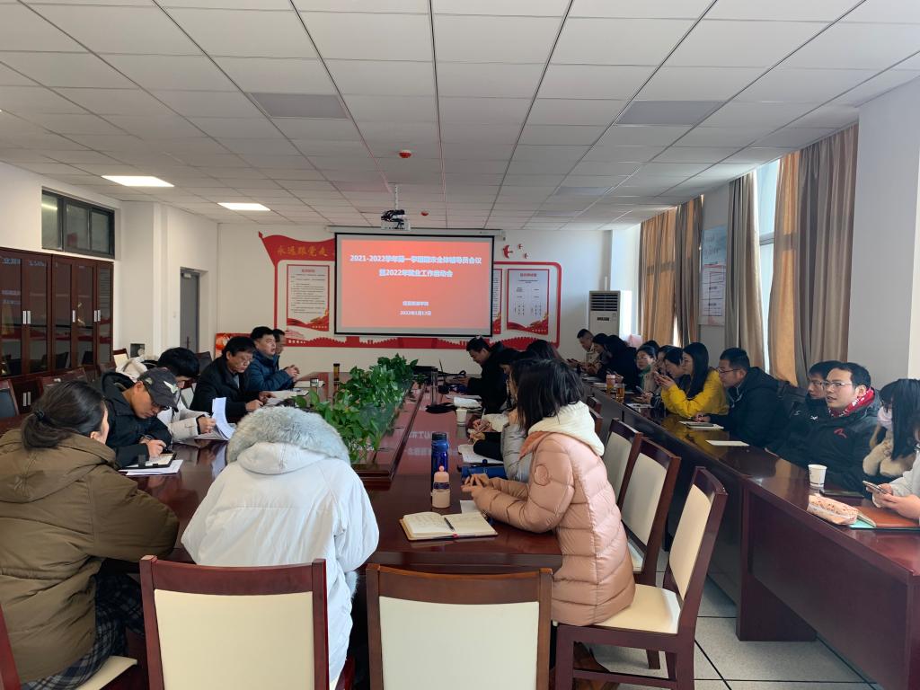 1月12日上午,经贸旅游学院在会议室召开2021-2022学年第一学期期末全体辅导员会议暨学院2022年就业工作启动会。学院党总支书记梅亚松、党总支副书记尹仕果、副院长刘圣春及全体专兼职辅导员参加了会议。