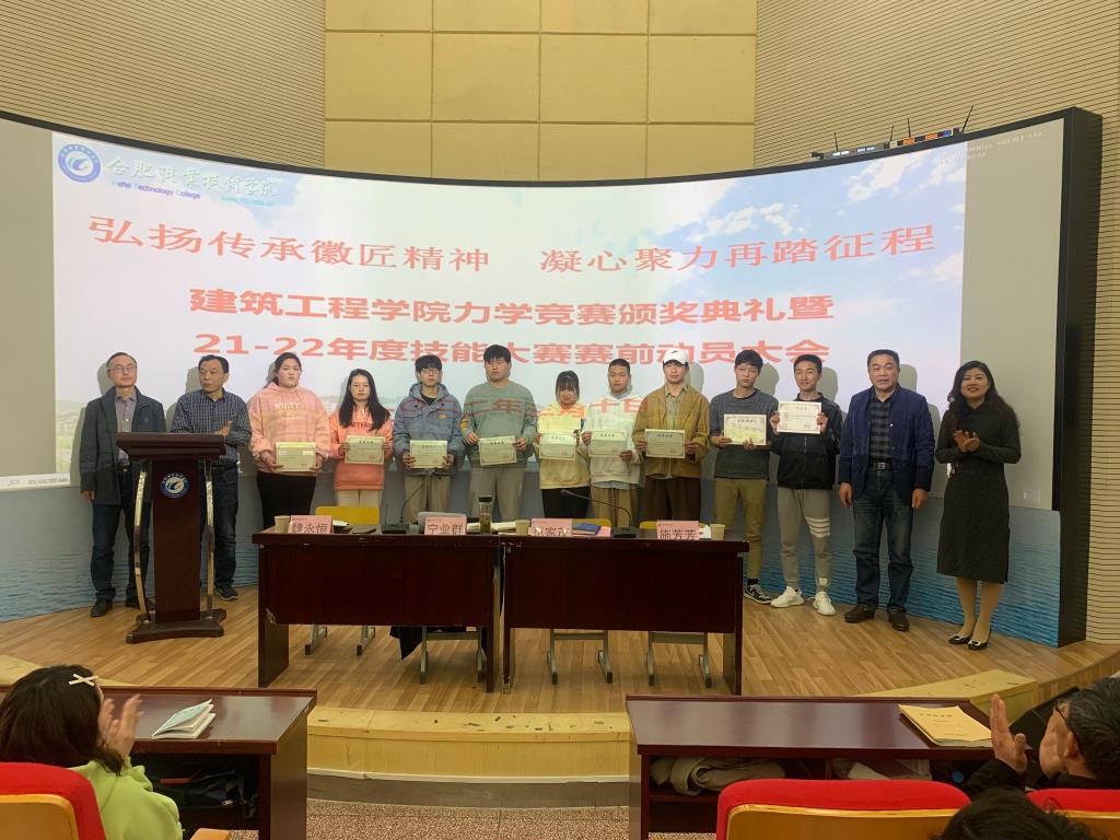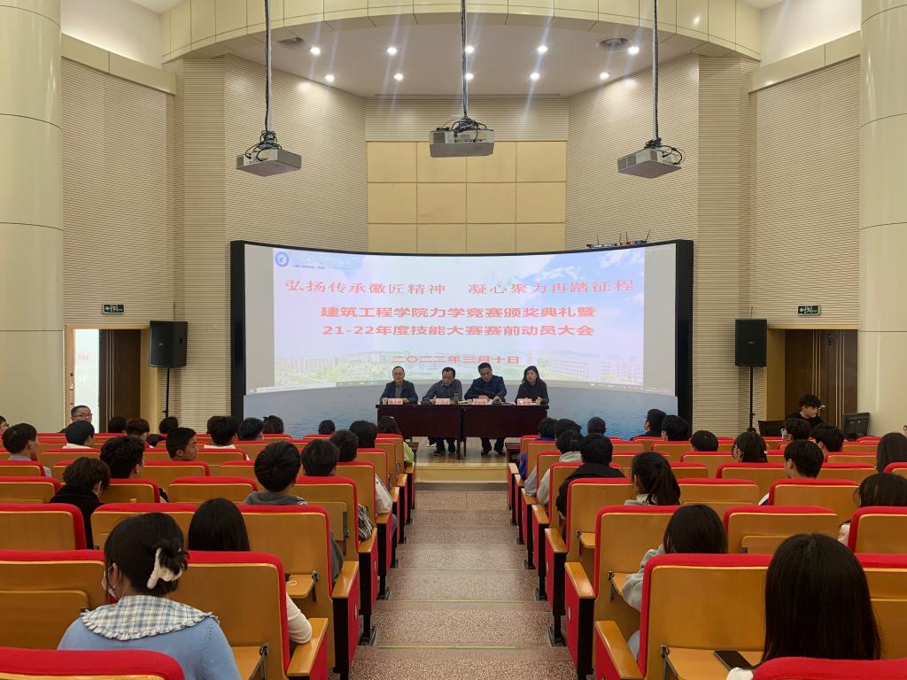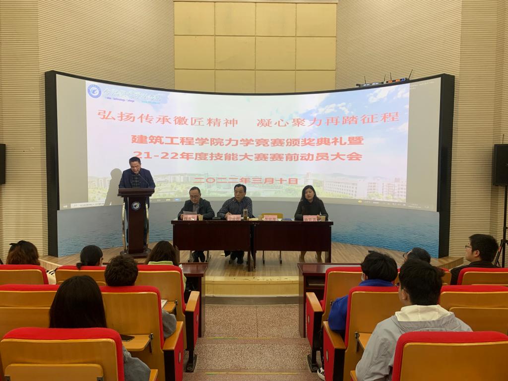 为大力弘扬传承徽匠精神,不断完善和创新“立足校企融合,传承徽匠精神的建筑类专业特色人才培养”,鼓励和表彰在安徽省大学生力学竞赛中获奖的同学及指导教师,为积极备战省校技能大赛的同学及指导教师加油鼓劲,3月10下午,建筑工程学院在鼓山校区图书馆二楼报告厅举行安徽省大学生力学竞赛颁奖典礼暨2021-2022年度安徽省职业院校高职组技能大赛赛前动员会。