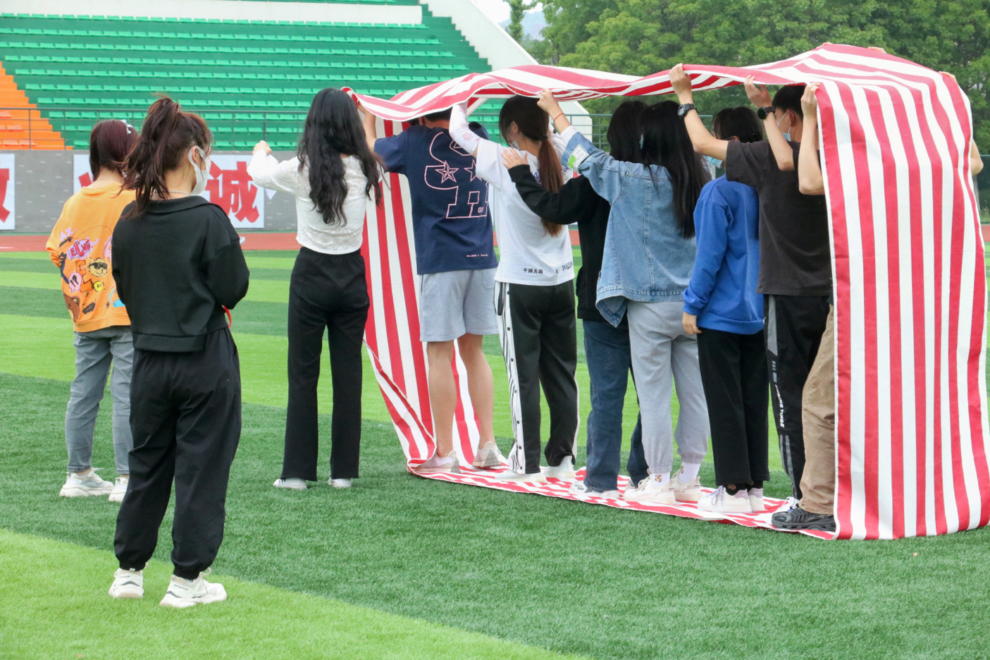 本次趣味心理运动会分为五个项目,在不同赛区同时进行。趣味拔河中各队心往一处想,劲往一处使,增强了队员之间的凝聚力。击鼓颠球由8人抓好八根绳子,将鼓拉起来,网球放在鼓上,保持网球一直在鼓上颠,对团队配合要求极高,队员们利用赛前有限的几分钟认真地练习,努力协调动作,随着排球在鼓面的跳动,宽阔的操场热闹了起来。欢乐旋风跑每队8人成一横队,用双手共同扶住一根长竿,绕立杆8字形变向跑,这一项目需要运动员们齐心协力、默契配合,大家摩拳擦掌,跃跃欲试,并相互提醒着各个注意点。无敌风火轮要求8个人一组站在“风火轮”中依次前进;摸石过河只能脚踩模型砖完成折返50米赛程......比赛在一阵又一阵的欢呼呐喊声中结束了。四月的阳光温柔而明媚,照耀着鼓山校区的操场,与同学们脸上的笑容融为一幅灵动的画卷。