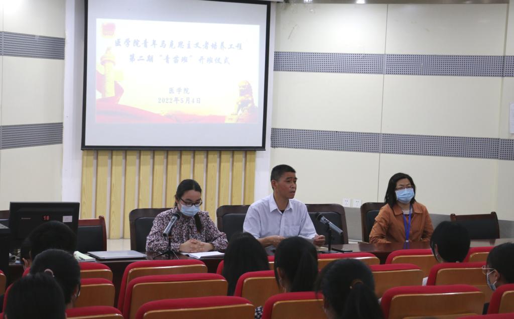 为引导广大青年向团组织靠拢,提升团员意识,团结带领广大团员青年发挥生力军和突击队作用,在广大优秀青年学生中着力培养造就一大批用马克思主义中国化最新成果武装的青年马克思主义者,在全校上下深入学习贯彻党的十九大和十九届历次全会精神、迎接党的二十大召开和建团百年之际,5月4日下午,医学院于图书馆一楼报告厅举行了第二期青年马克思主义者培养工程青苗班开班仪式。医学院党总支书记张明、党总支副书记孙美兰及全体学管老师出席仪式,开班仪式由医学院团总支书记刘惠主持。