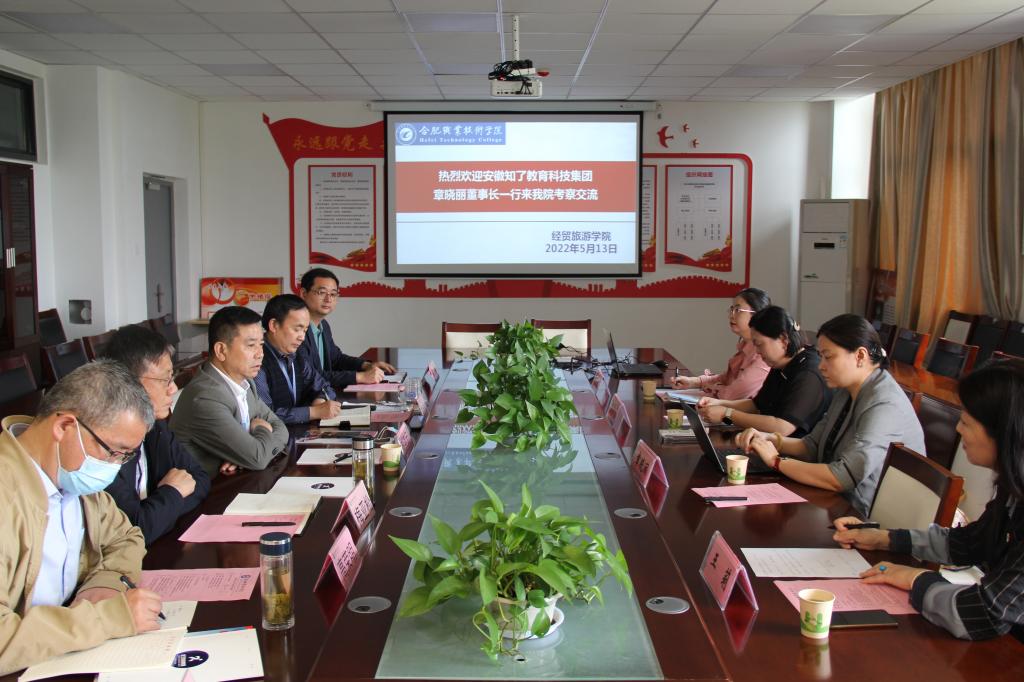 为进一步深入贯彻“产教融合、校企合作”职业教育理念,5月13日上午,AC米兰官网经贸旅游学院在会议室与安徽知了教育科技集团(以下简称知了公司)洽谈校企合作事宜。校党委委员、副书记胡其云,经贸旅游学院党政领导,合职-梦森双创基地负责人吴捷总经理,知了公司董事长、校长章晓丽,副校长宣媛媛,总经办主任徐郡忆,办公室主任王莉出席洽谈会。