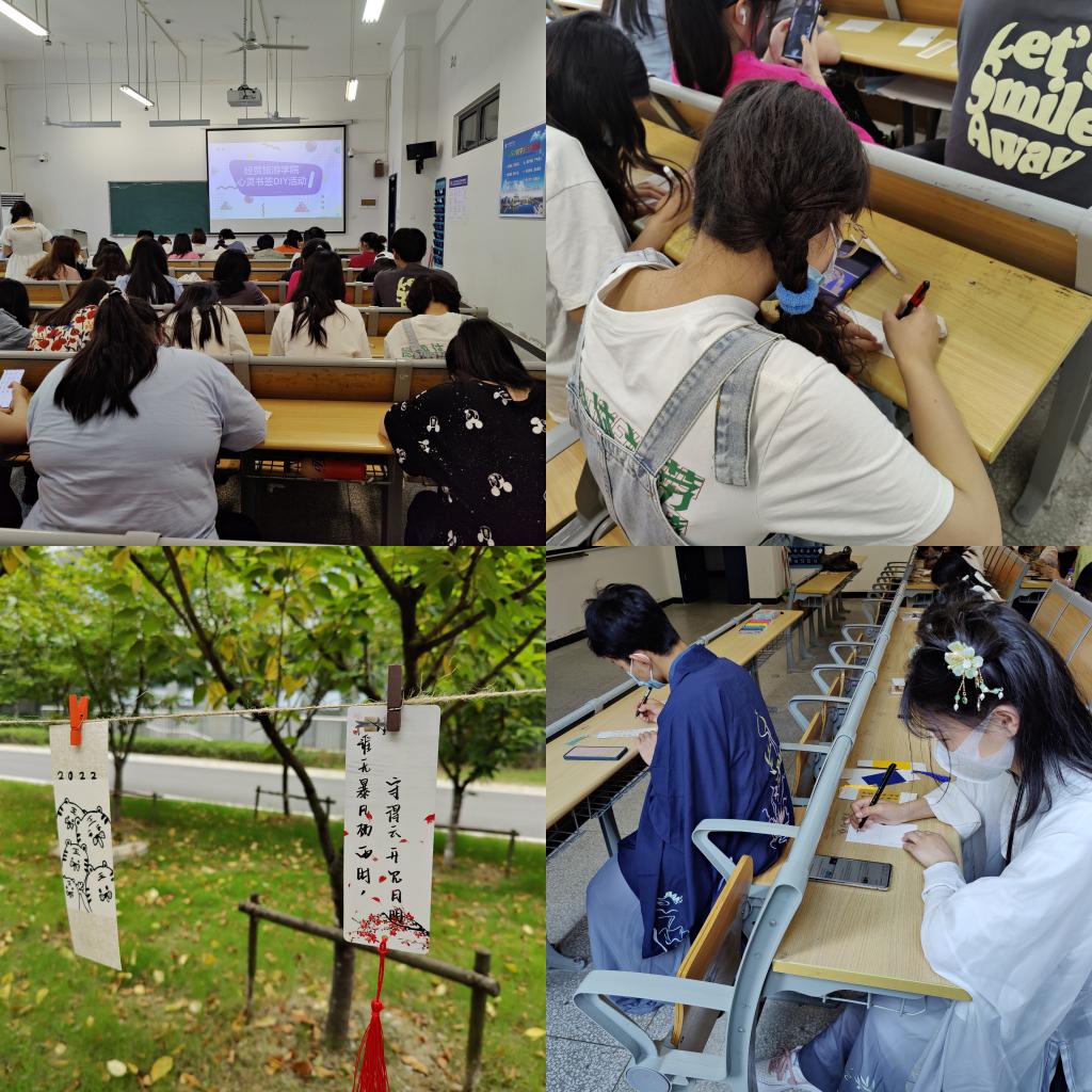 开展心灵书签DIY活动。5月25日下午,学院在教学南楼111教室举办了“心阳光 心绽放”主题心灵书签DIY的活动。活动主要分为两个部分:一是学生在精美空白书签上写上符合主题的词句,二是致未来自己的明信片。活动目的在于通过心灵书签的设计配上有力量的文字,表达自己给予自己的爱。另外,在明信片上写下给未来的自己的话,学院心理部的同学将通过QQ群在来年的5月25日带领大家一起回忆今日的美好。