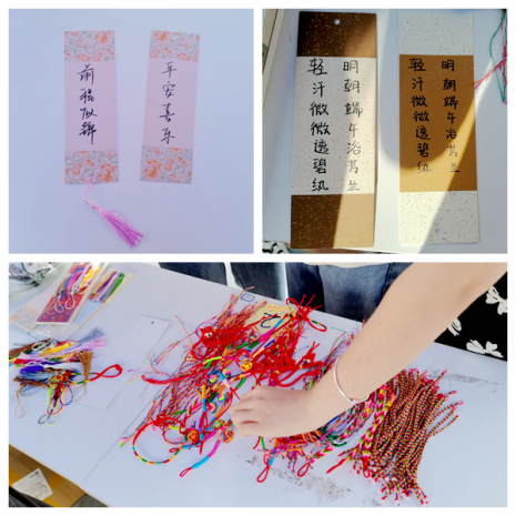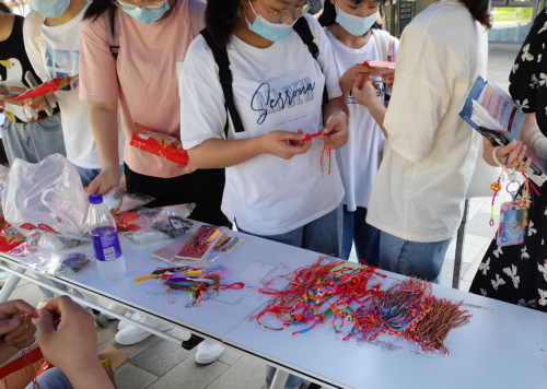 活动主要分为三大块:制作手工香囊。由同学们自己现场亲手制作香囊。自古以来每年端午前后佩戴香囊,通过药物的味道挥发驱赶虫蚊,瘴气,毒物,也为我们的疫情防控助力;DIY五色绳。由同学们自己现场DIY彩绳。古代人崇拜五色,以五色为吉祥色,端午节佩戴五色绳是重要的习俗之一,它有祈福纳吉的美好寓意;书签写祝福。同学自由写书签,书写美好寓意的词句,用于祝福朋友家人安康。