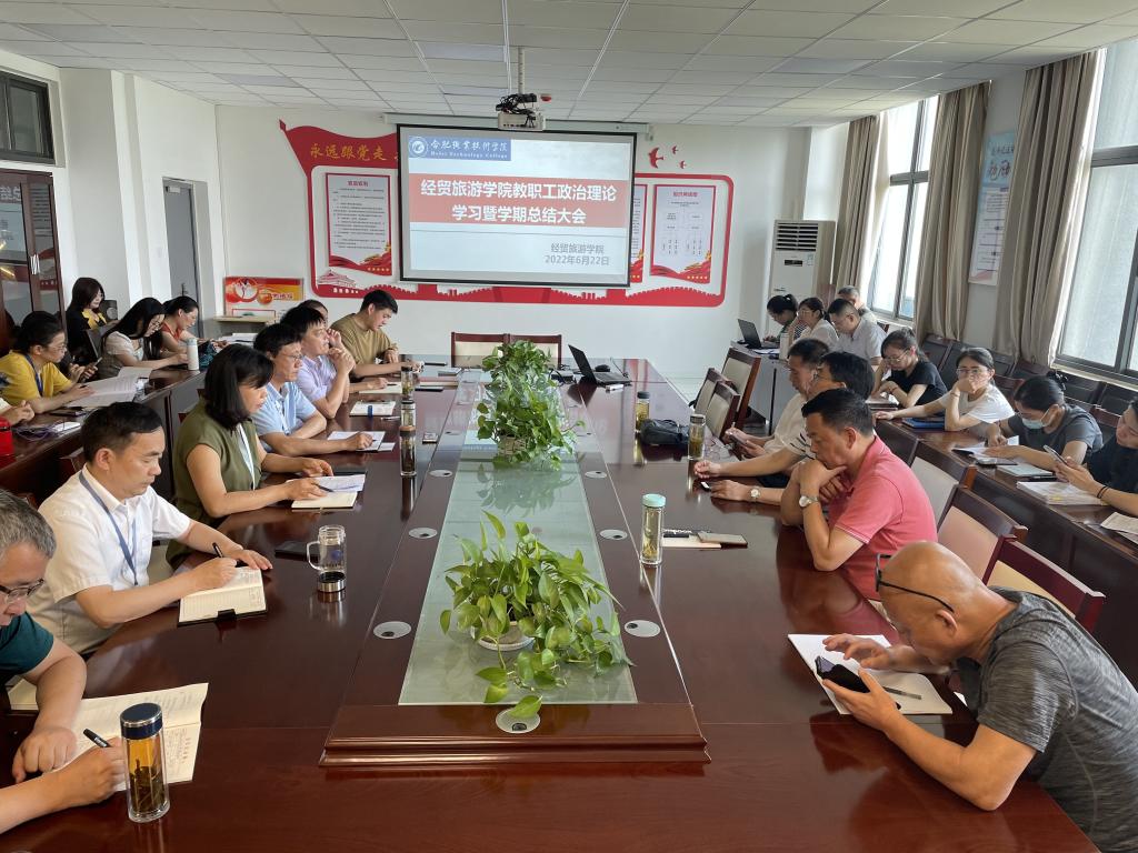 6月22日下午,经贸旅游学院在会议室召开政治理论学习暨学期工作总结大会。学院党政、全体教职工参会,会议由党总支副书记尹仕果主持。