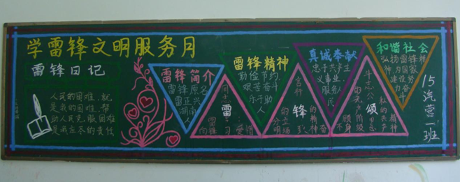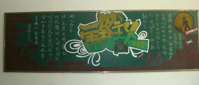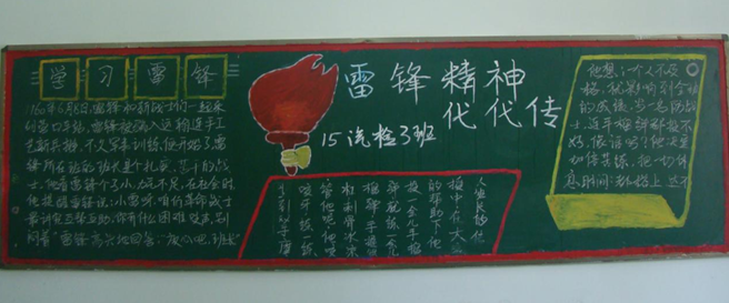 黑板报设计大赛受到各班师生积极响应。学生们积极参与,精心设计,一幅幅主题鲜明的板报,全面地诠释了新时期雷锋精神的内涵和要义。有的板报介绍雷锋的生平;有的宣传雷锋的感人事迹;有的介绍身边的活雷锋……表达了同学们对雷锋的尊敬和怀念之情。