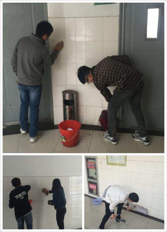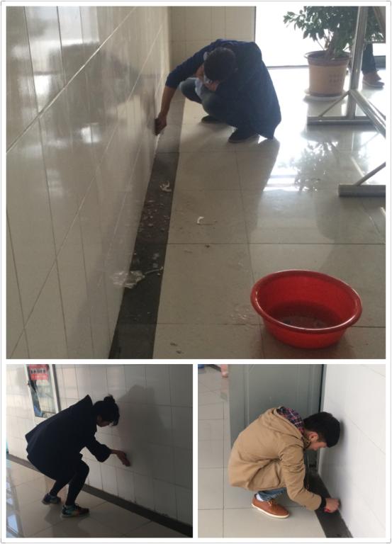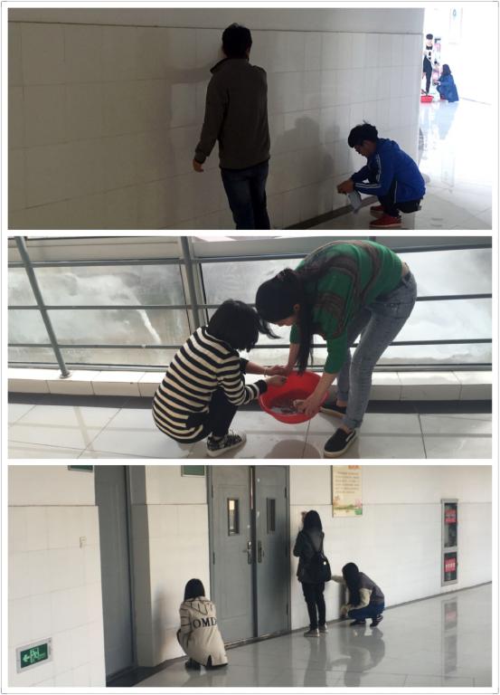 本次清扫的重点是走廊墙壁和楼梯,清理墙面及墙角的污渍。经过分工后,同学们便有条不紊的分组行动起来。鉴于墙壁的不易擦拭,学生们用清洁球和小铲子对污垢进行清洗。
